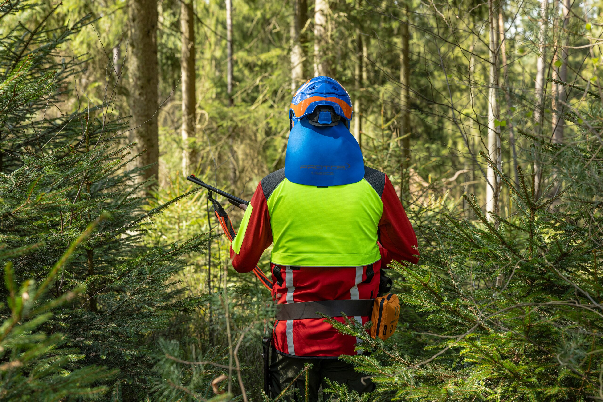 Ova Protos Integral kombinacija zaštite za glavu poseban je model za tragače i goniče, koja kombinuje najviše sigurnosne standarde s izvrsnom udobnošću nošenja. Zaštitu pruža štitnik za vrat, koji se proteže daleko niz vrat, i usko prianjajući štitnici za uši koji ublažavaju udarce i potrese u stražnji dio glave. Zaštita za uši, certificirana prema EN 352-3, individualno se podešava. Sklopivi vizir F39, izrađen od jetkanog metala (EN 1731), nudi optimalnu zaštitu u gustom grmlju zahvaljujući visokoj propusnosti svjetlosti i 39 otvora po kvadratnom centimetru, sprječavajući ozljede lica trnjem i iglama. Za dodatnu udobnost, Protos kombinacija za praćenje ima velikodušno dimenzionirane, zatvarajuće ventilacijske otvore na vrhu.
